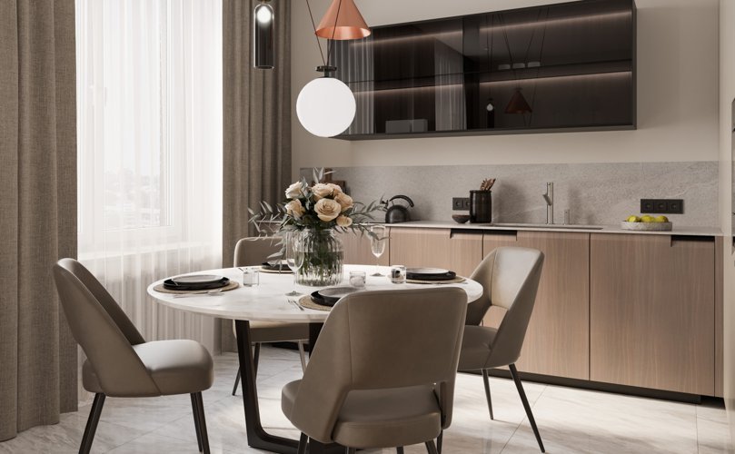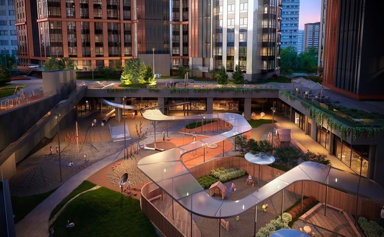 На первых этажах комплекса предусмотрены фитнес-студия, ресторан и коворкинг. Внутренний двор без машин представляет двухуровневое пространство. Для детей отведен нижний уровень, а верхний уровень предназначен для досуга взрослых с местами для спорта, занятий йогой, шезлонгами и деревянными террасами. А ночью во дворе предусмотрен свето-дизайн.