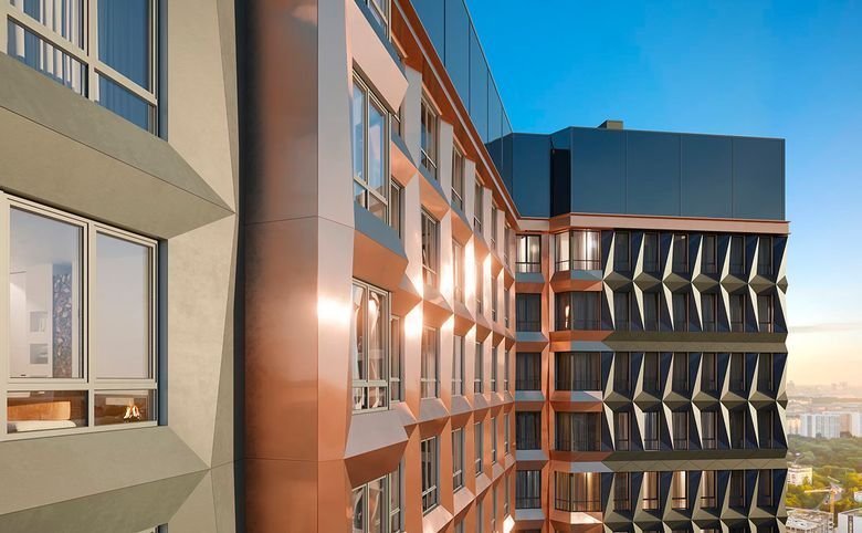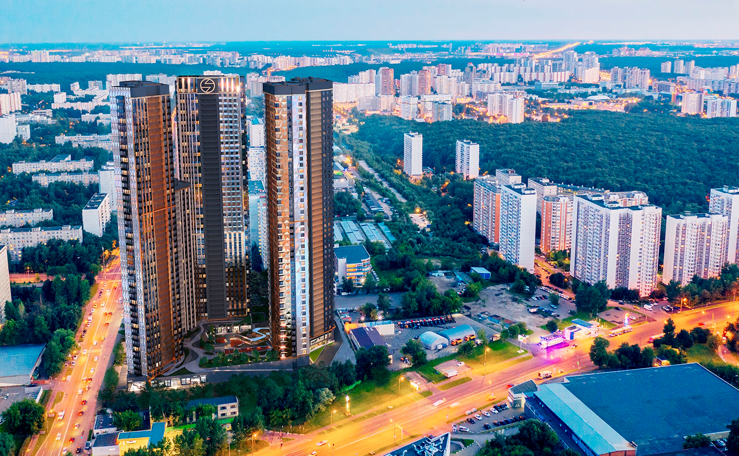Проект включает в себя 3 жилых корпуса с переменной этажностью от 28 до 47 этажей. Фасады зданий представляют собой объемные геометрические панели разных цветов. В проекте реализована система «умный дом».
